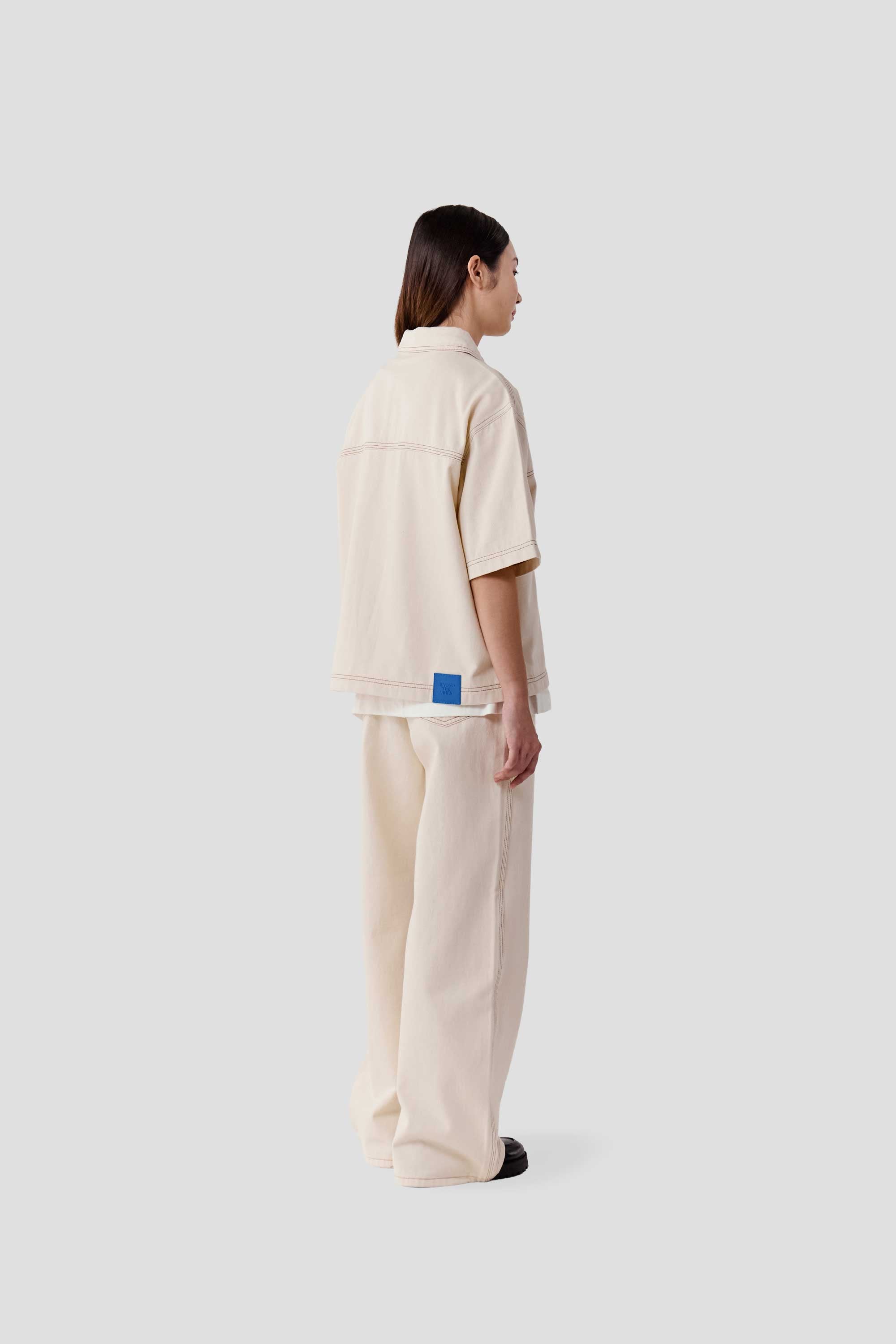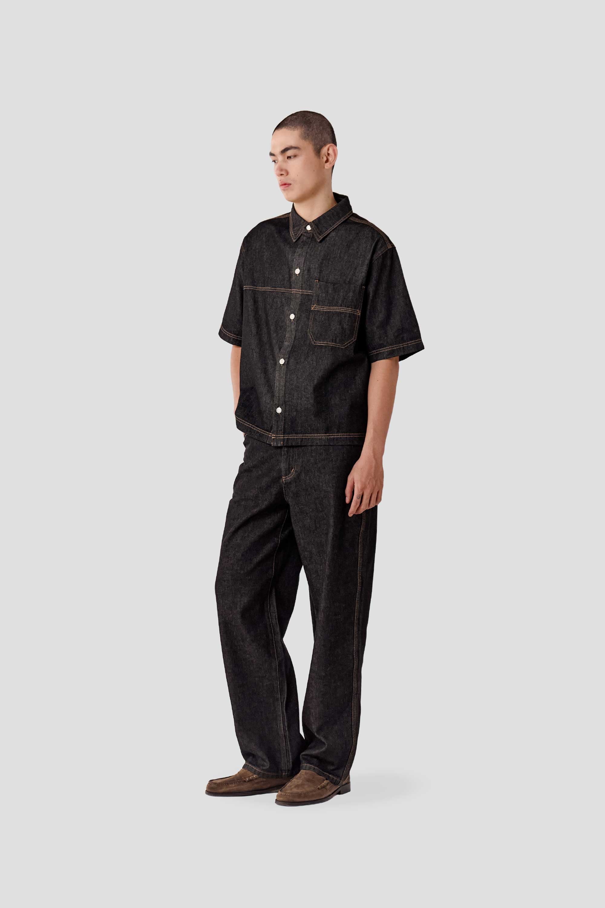 Made from 100% soft cotton denim, this unisex shirt features a boxy silhouette, a classic collar and a full button down placket. Designed with contrast stitching details and a back yoke, it is finished with branded metal buttons and an engineer blue suede patch on the back hem.