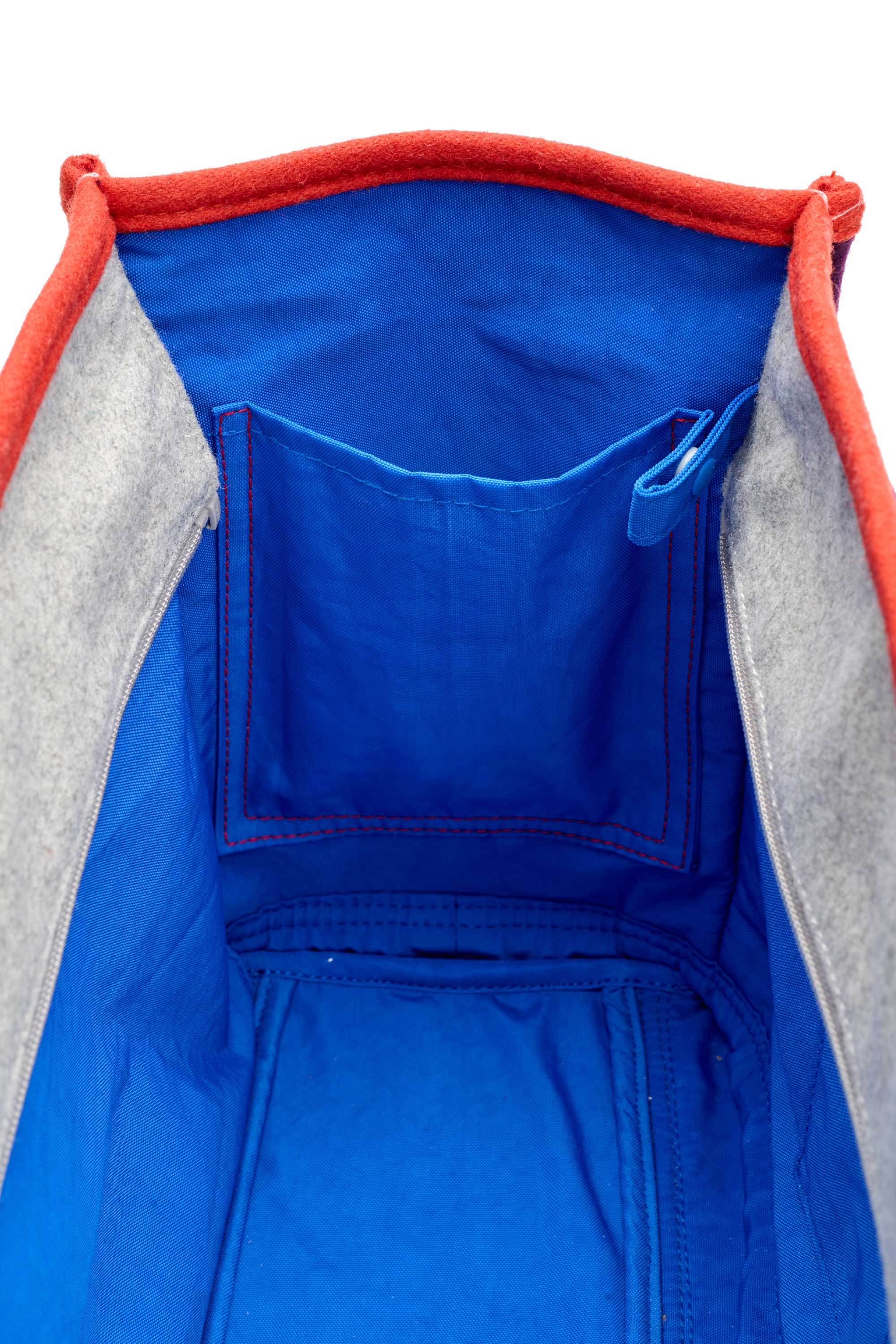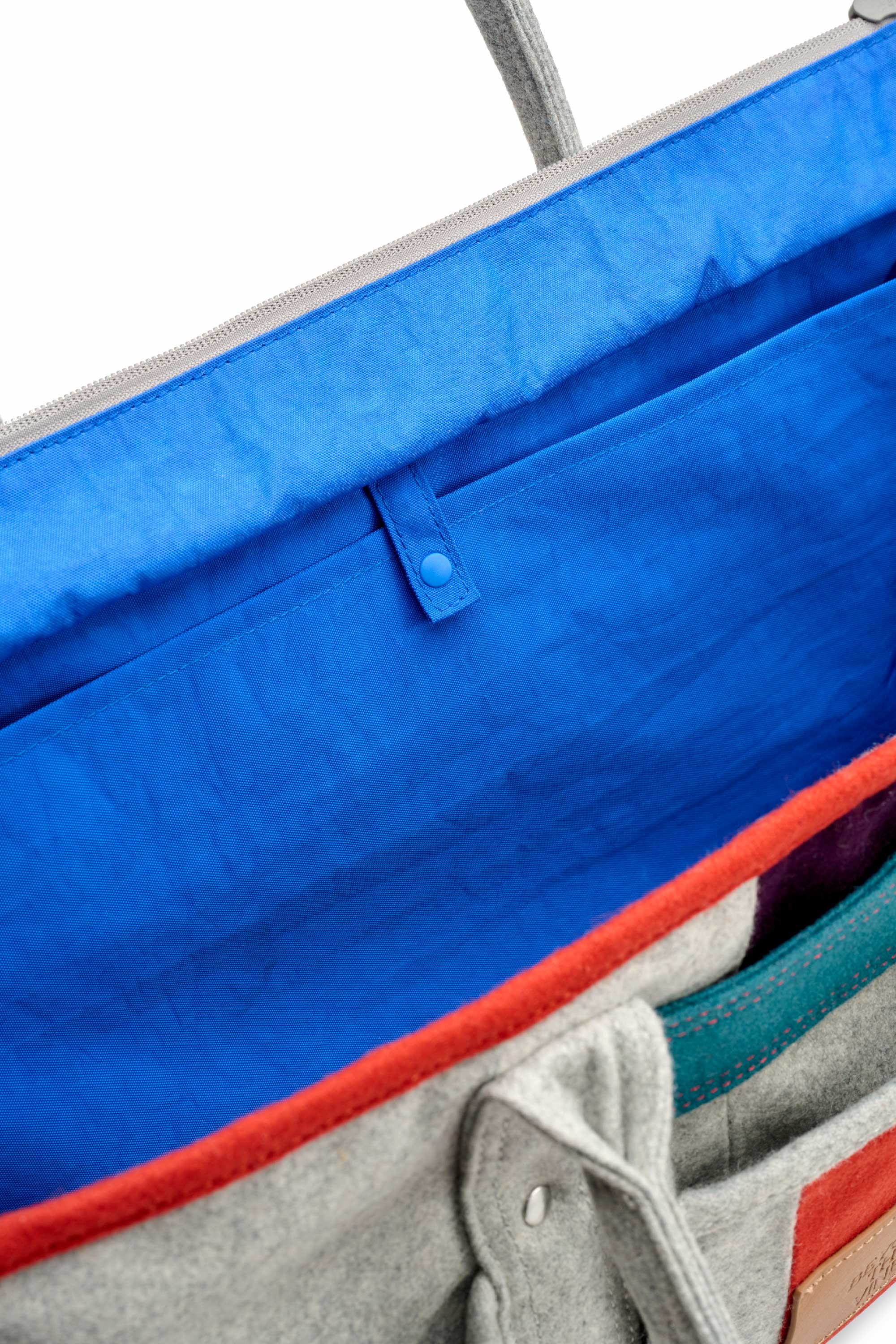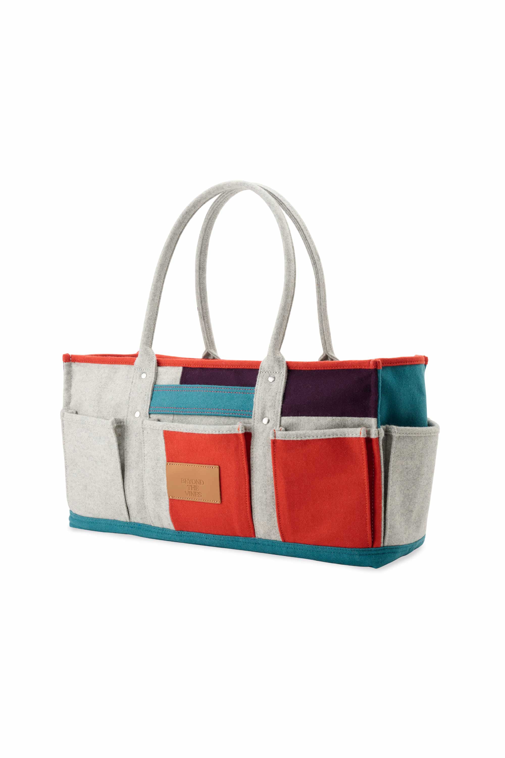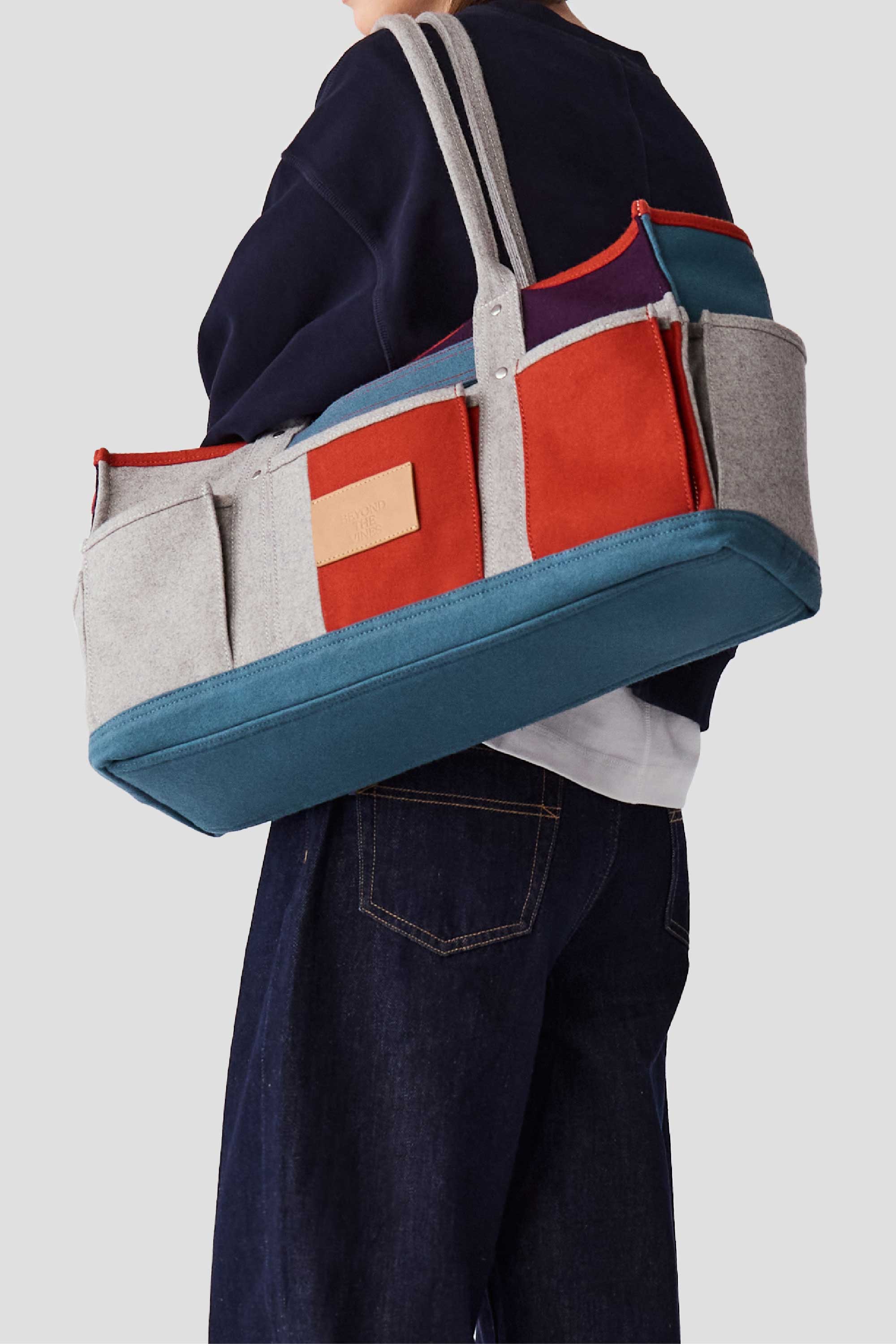 Made from structured felt, this colourblock panelled bag features a wide, elongated silhouette. Designed with gusseted pockets on the outside and a luggage slot at the back that doubles as a zipper pocket when not in use. Detailed with a leather debossed label and contrast stitching on the front, the bag also includes an inner pocket for essentials, a water bottle slot, and a padded laptop compartment for added convenience.