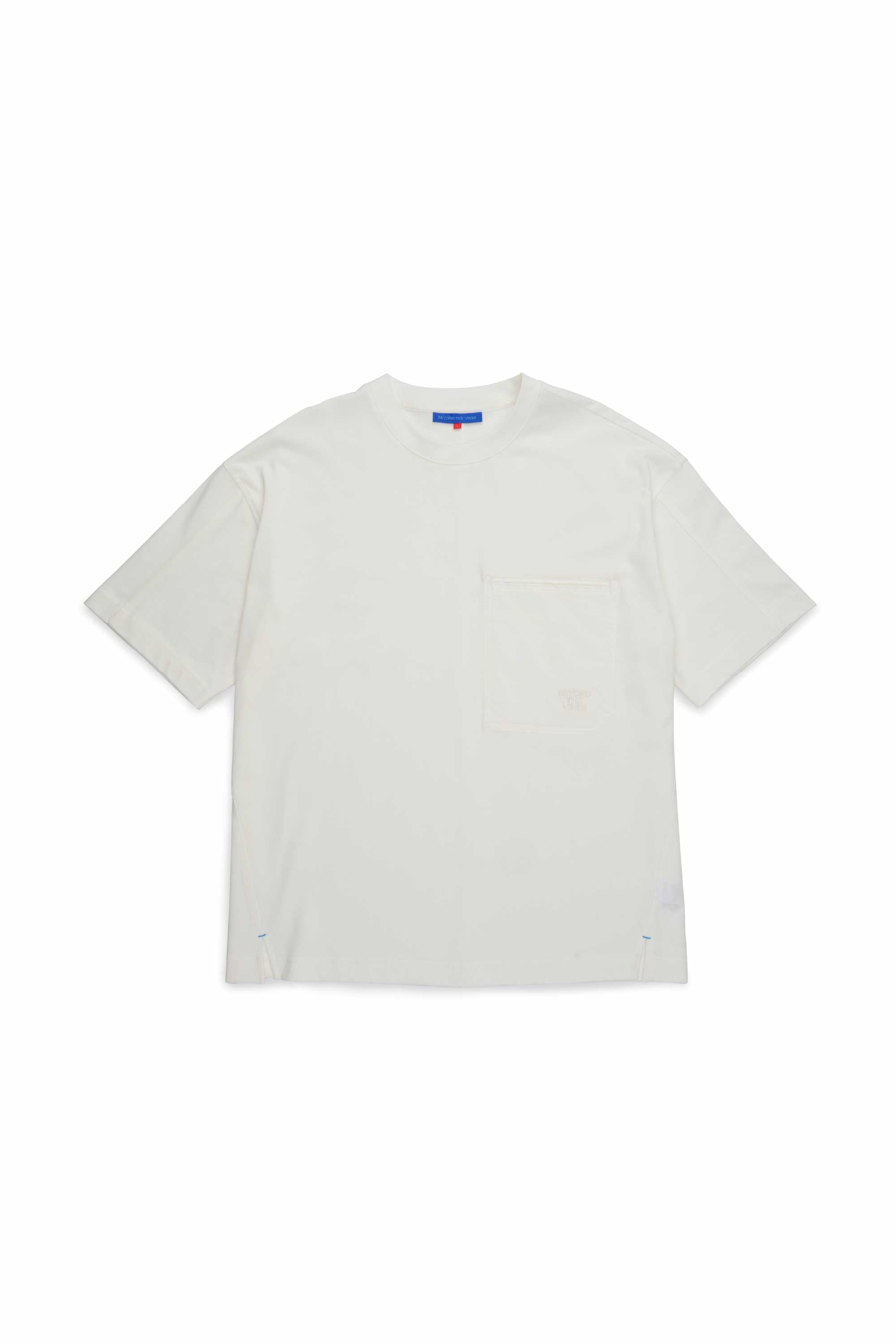 This relaxed-fit T-shirt features offset sleeve seams that contour naturally along the shoulder, paired with a split hem. A centre-back flatlock stitch runs cleanly down the spine, giving the silhouette a quiet architectural line. At the chest, an internal topstitched pocket is finished with tonal binding, complete with an understated embroidered logo.